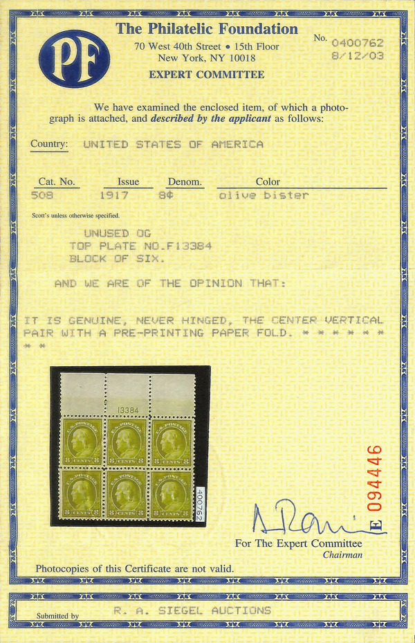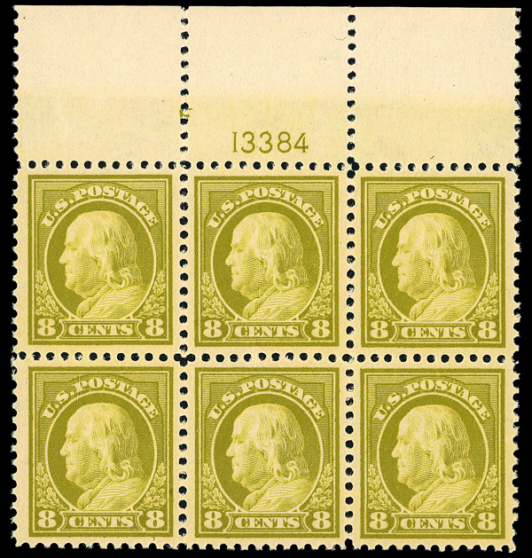 5178 nhbl 508 image1917, 8¢ olive bister, perf. 11 (Scott 508), top margin plate block of 6, overall very well centered, o.g., never hinged; center stamps with vertical pre-print paper fold, Extremely Fine, with 2003 P.F. certificate.