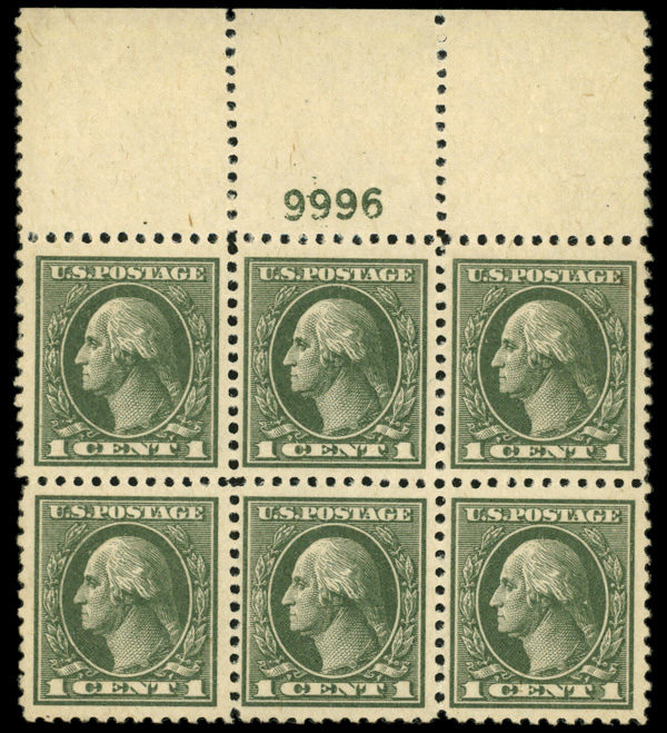 5171 ogbl 498 image1917, 1¢ green, perf. 11 (Scott 498), top margin plate block of 6, Bright color, full of life, disturbed o.g., Extremely Fine.