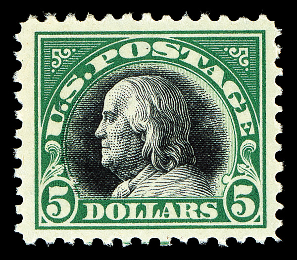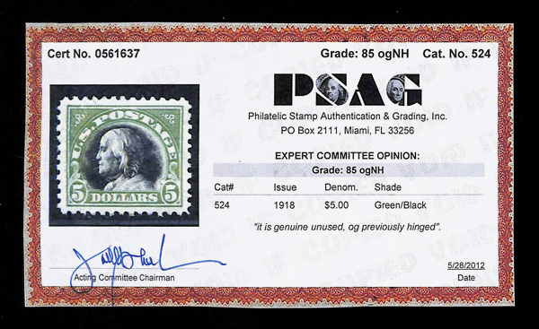 5188 og 524 image1918, $5 deep green & black (Scott 524), o.g., small hinge mark in top left corner, beautiful bright green shade and strong vignette colors and impressions, Very Fine to Extremely Fine, with 2012 P.S.A.G. certificate graded VF-XF 85 (incorrectly stating NH).