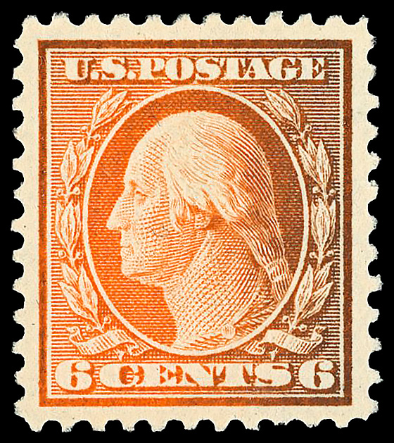 5161 nh 468 image1916, 6¢ red orange, unwatermarked, perf. 10 (Scott 468), o.g., never hinged, wonderfully centered; oxidized at right, otherwise Extremely Fine.
