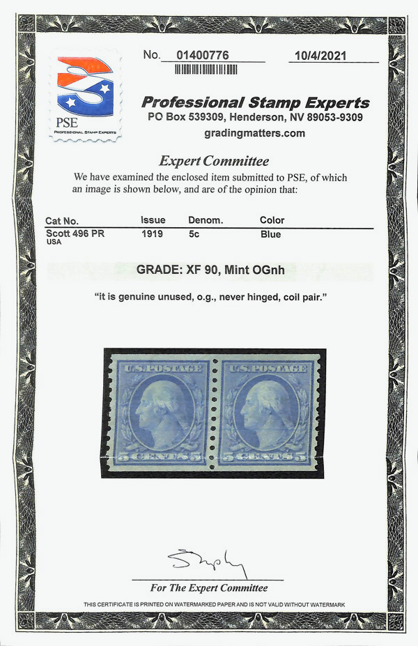 5169 nh 496 image1919, 5¢ blue, unwatermarked, rotary press coil, perf. 10 vertically (Scott 496), pair, Glowing vibrant color tone, o.g., never hinged, Extremely Fine, with 2021 P.S.E. certificate graded XF 90.