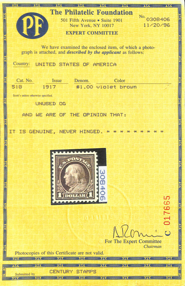 5187 nh 518 image1917, $1 violet brown, perf. 11 (Scott 518), o.g., never hinged, Extremely Fine, with 1996 P.F. certificate.