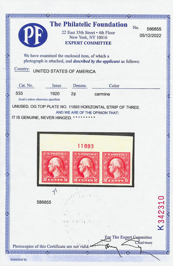 5197 nh 533 image1918, 2¢ carmine, type V, offset printing, imperf. (Scott 533), o.g., never hinged, Very Fine to Extremely Fine, with photocopy of 2022 P.F. certificate for strip.