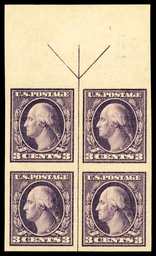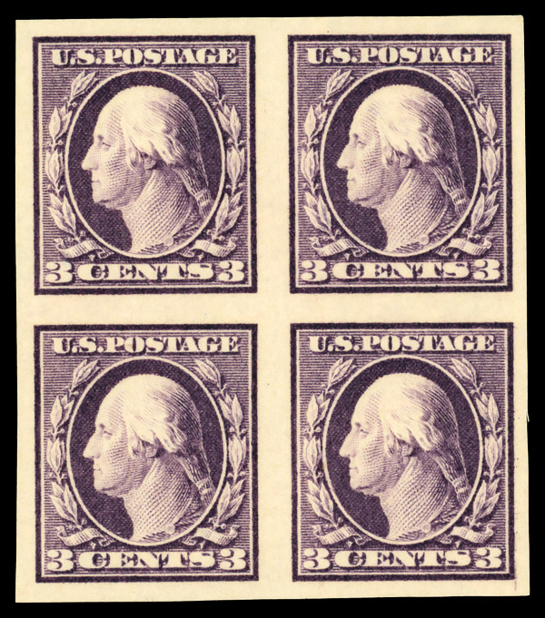 5167 nhbl 484 image1916, 3¢ violet, type II, unwatermarked, imperf. (Scott 484), arrow block of 4, o.g., never hinged, Extremely Fine.