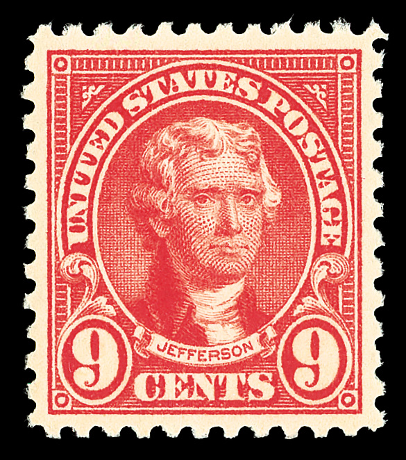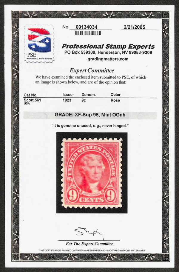 5225 og 561 image1923, 9¢ Jefferson (Scott 561), o.g., very lightly hinged, Extremely Fine, with P.S.E. encapsulated certificate graded XF 90.