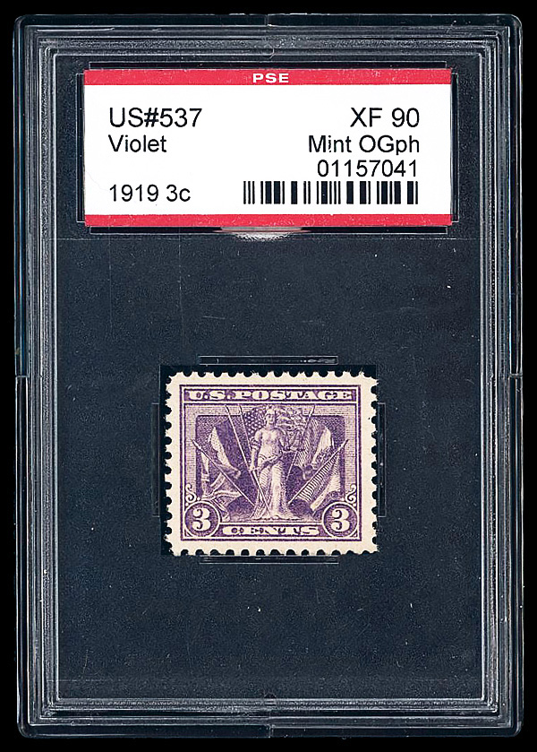 5203 og 537 image1919, 3¢ Victory (Scott 537), o.g., very lightly hinged, Extremely Fine, with P.S.E. encapsulated certificate graded XF 90.