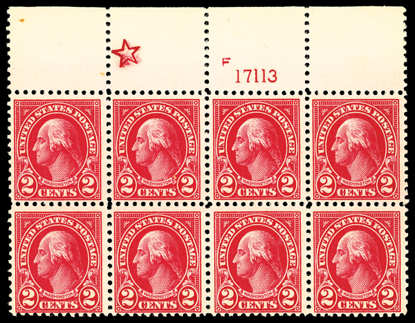 5216 nh/ogbl 554 image1923, 2¢ Washington (Scott 554), top margin plate block of 8 with five point star, Beautiful bold color, 3 center stamps o.g. lightly hinged, 5 stamps never hinged, Fine.