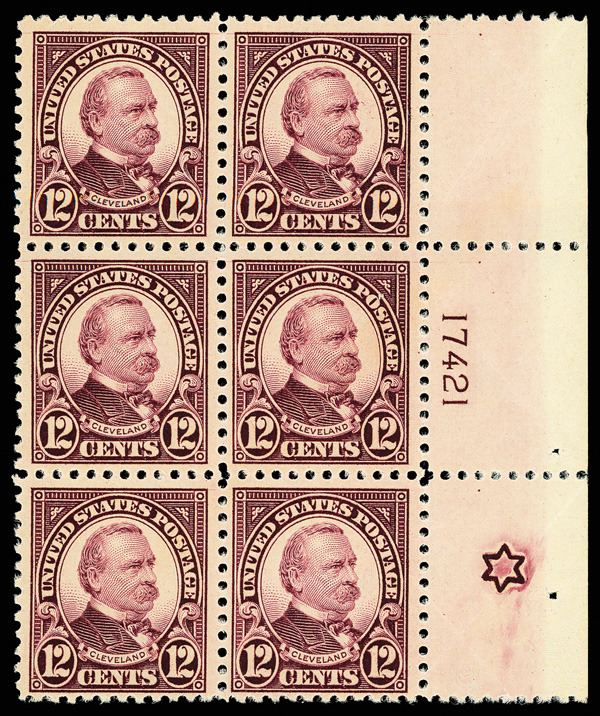 5229 nh/ogbl 564 image1923, 12¢ Grover Cleveland (Scott 564), right margin plate block of 6 with six point star, Stunning vibrant hue, o.g., top right stamp lightly hinged (5 stamps never hinged), Fine to Very Fine.