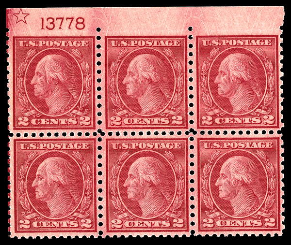 5206 ogbl 540 image1919, 2¢ carmine rose, type II, rotary press coil waste, perf. 11 x 10 (Scott 540), top margin plate block of 6 with S 30, Attractive rich color depth, disturbed o.g., Fine to Very Fine.