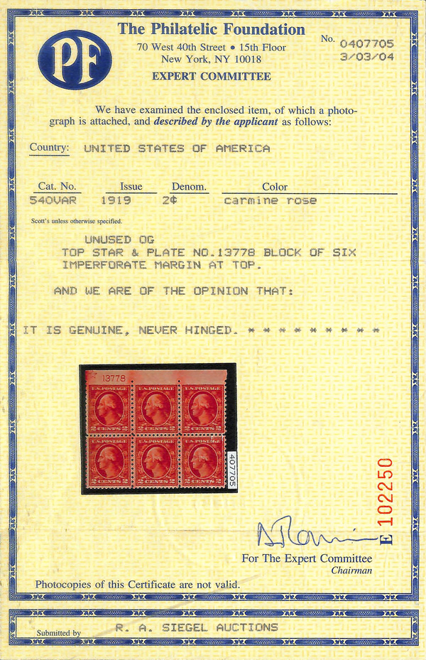 5207 nhbl 540 image1919, 2¢ carmine rose, type II, rotary press coil waste, perf. 11 x 10, imperf at top margin (Scott 540), plate block of 6 with star, o.g., never hinged, Very Fine to Extremely Fine, with 2004 P.F. certificate.
