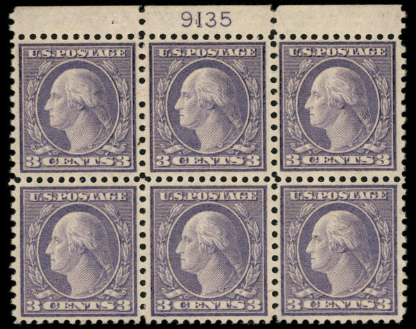 5208 nhbl 541 image1919, 3¢ violet, rotary press coil waste, type II, perf. 11 x 10 (Scott 541), top margin plate block of 6, Exceptionally bright and clean, o.g., never hinged, lightly hinged in top selvage; slight perf separation at top, Fine to Very Fine.