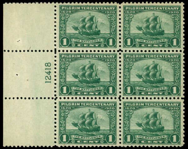5212 nhbl 548 image1920, 1¢ Pilgrim (Scott 548), left margin plate block of 6, Strong and lively color, o.g., never hinged, Very Fine to Extremely Fine.