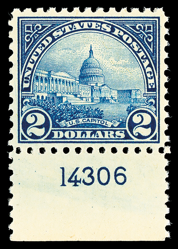 5238 nh 572 image1923, $2 U.S. Capitol (Scott 572), bottom margin single with plate number, Deep glowing ink color, o.g., never hinged; tiny natural gum skip, Very Fine to Extremely Fine, with 2022 P.S.E. certificate graded VF-XF 85.