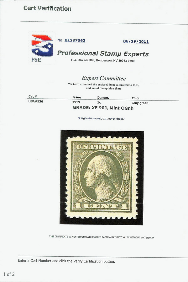 5202 nh 536 image1919, 1¢ gray green, offset printing, perf. 12½ (Scott 536), Glowing freshness, full appeal, o.g., never hinged, Extremely Fine, with photocopy of 2011 P.S.E. certificate graded XF 90J.