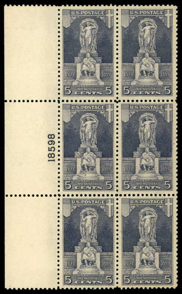 5268 nhbl 628 image1926, 5¢ Ericsson (Scott 628), plate block of 6, o.g., never hinged, Very Fine to Extremely Fine.