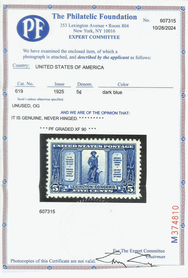5259 nh 619 image1925, 5¢ Lexington-Concord (Scott 619), o.g., never hinged, Extremely Fine, with 2024 P.F. certificate graded XF 90.