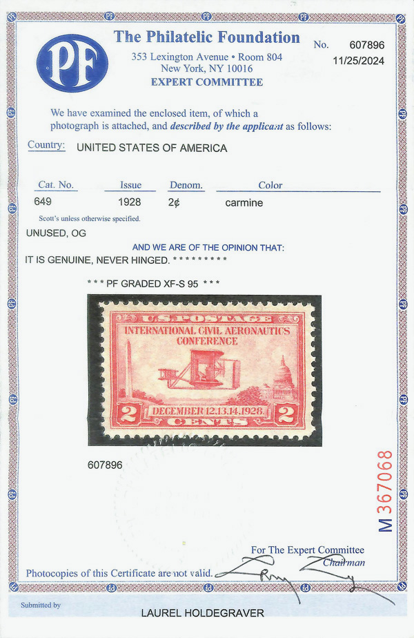 5280 nh 649 image1928, 2¢ Civil Aeronautics (Scott 649), o.g., never hinged, Extremely Fine to Superb, with 2024 P.F. certificate graded XF-SUP 95.