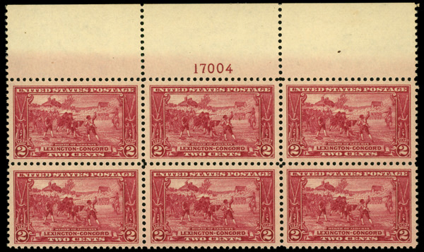 5258 nhbl 618 image1925, 2¢ Lexington-Concord (Scott 618), top margin plate block of 6, Wonderfully deep ink tone, o.g., never hinged, Very Fine to Extremely Fine.