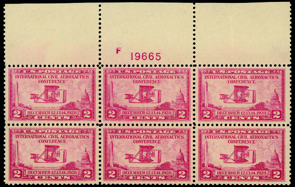 5276 nhbl 645 image1928, 2¢ Valley Forge (Scott 645), top margin F plate block of 6, Deep full-bodied color, o.g., never hinged, Very Fine.