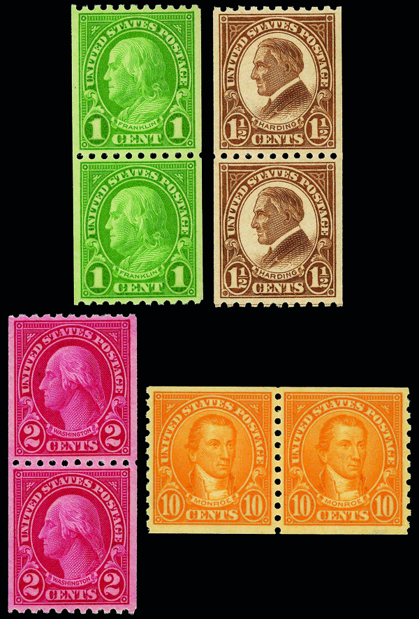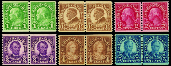 5248 nh 597-599, 600-606 image1923-25, 1¢-10¢ Regular Issue Coils (Scott 597-599, 600-606), set of 10, pairs, o.g., never hinged, Very Fine to Extremely Fine.