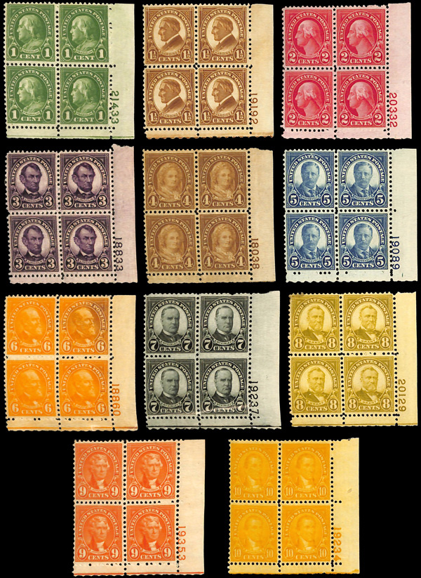 5271 nhbl 632-634, 635-642 image1926-34, Rotary press definitives, perf. 11 x 10½ 1¢ to 10¢ complete (Scott 632-634, 635-642), set of 11, plate blocks of 4, o.g., never hinged, Very Fine to Extremely Fine.