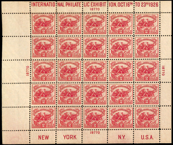 5267 nhbl 627 image1926, 2¢ Sesquicentennial Exposition (Scott 627), plate block of 6, o.g., never hinged, Very Fine to Extremely Fine.