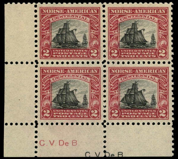 5262 nhbl 620 image1925, 2¢ Norse-American (Scott 620), corner margin block of 4, o.g., never hinged, Extremely Fine to Superb.