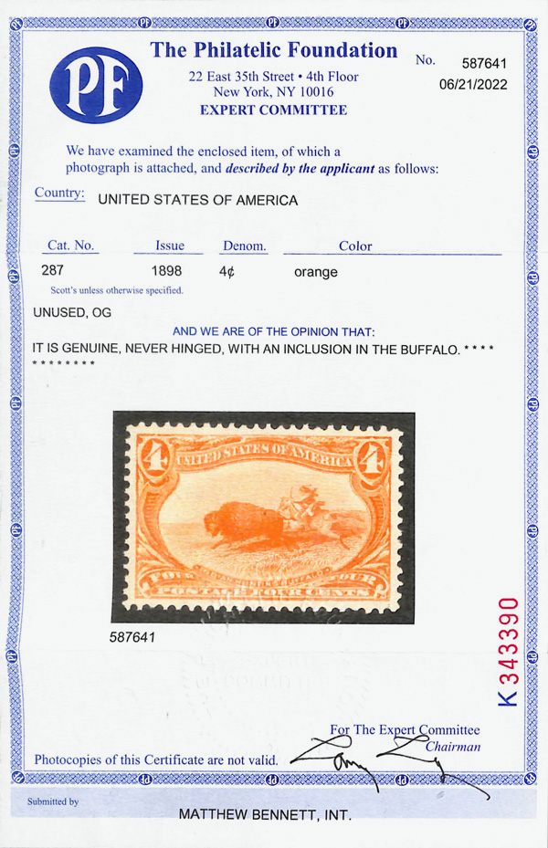 6547 nh 287 image1898, 4¢ Trans-Miss. (Scott 287), o.g., never hinged; paper inclusion & sulphurized, Extremely Fine, with 2022 P.F. certificate.
