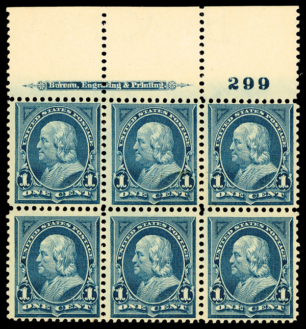 6541 nhbl 264 image1895, 1¢ blue, D.L. watermark (Scott 264), wide top margin plate block of 6 with plate number 299, Brightly colored with precision, o.g., never hinged, Fine to Very Fine.