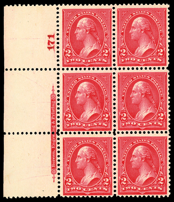 6542 nhbl 267 image1895, 2¢ carmine, type III, D.L. watermark (Scott 267), wide left margin plate block of 6 with plate number 171, Deeply struck and vibrant, o.g., never hinged, Fine to Very Fine.