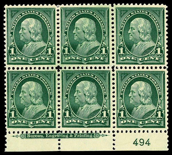 6543 nhbl 279 image1898, 1¢ deep green (Scott 279), bottom margin plate block of 6 with plate number 494, Fresh, glowing tone preserved, o.g., never hinged, Very Fine.