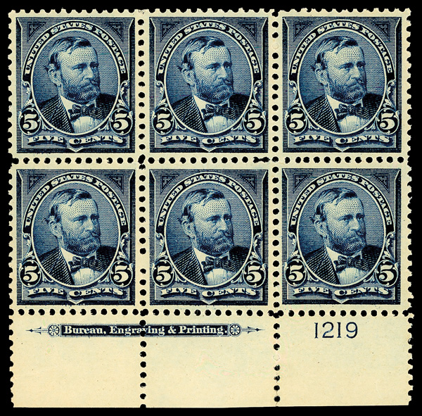6544 ogbl 281 image1898, 5¢ dark blue (Scott 281), bottom margin plate block of 6 with plate number 1219, Clear deep early color, o.g., previously hinged; 2.5mm tear on bottom left stamp, small crease on top left stamp, Very Fine.