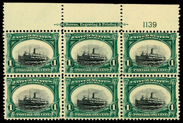 6548 nhbl 294 image1901, 1¢ Pan-American (Scott 294), top margin plate block of 6 with plate number 1139, Bold tone, appearing freshly printed, o.g., never hinged, Fine to Very Fine.