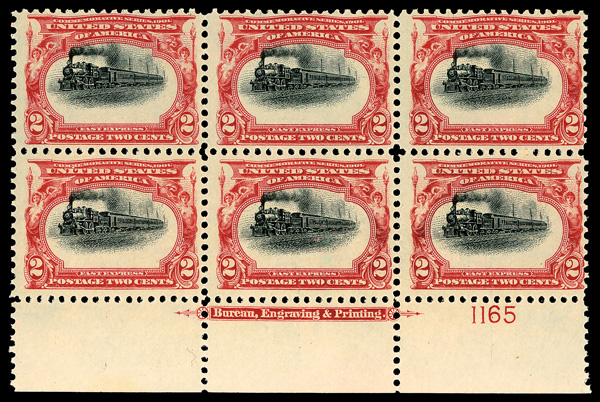 6549 nhbl 295 image1901, 2¢ Pan-American, High Shifted Train Variety (Scott 295), bottom margin plate block of 6 with plate number 1165, Fresh strong color impression, o.g., never hinged, Fine.