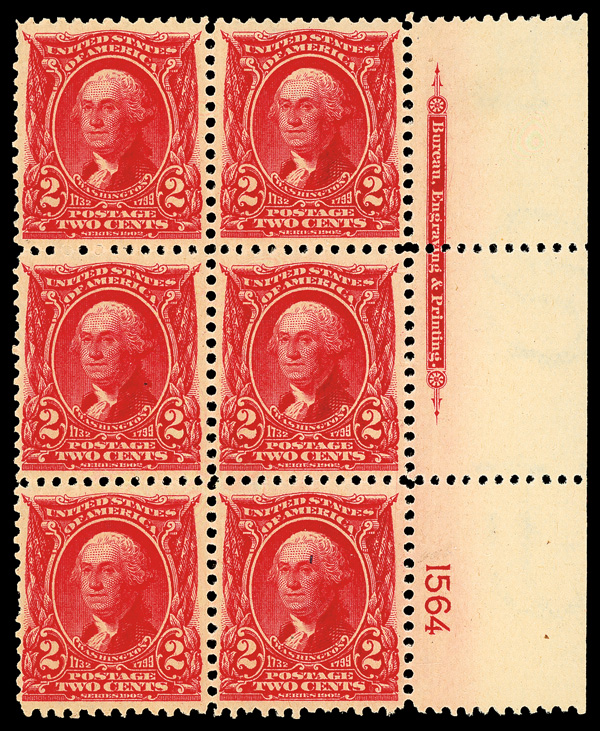 6559 nhbl 332 image1908, 2¢ carmine, D.L. watermark (Scott 332), wide top margin plate block of 6 with plate number 4822, Bright tone, wonderfully preserved, o.g., never hinged, Very Fine.