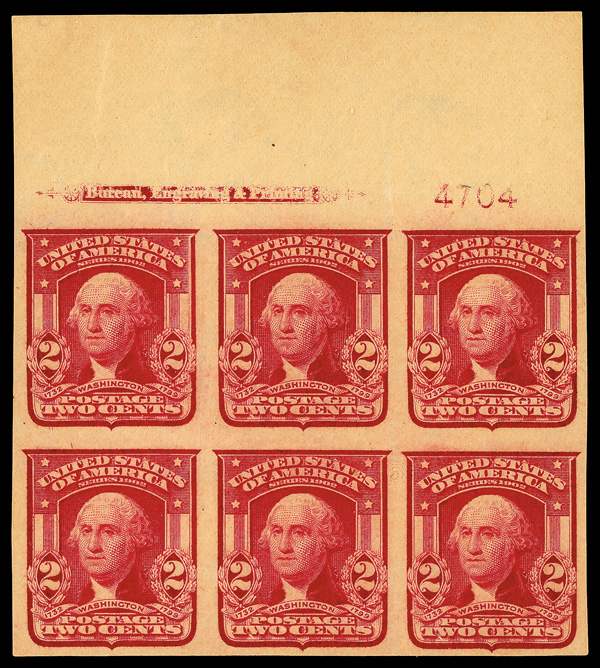 6553 ogbl 320A image1906, 2¢ lake, type II, imperf. (Scott 320A), wide top margin plate block of 6 with plate number 4704, Lovely freshness and depth, o.g., previously hinged; light overall toning, Very Fine, with 2023 P.S.E. certificate.