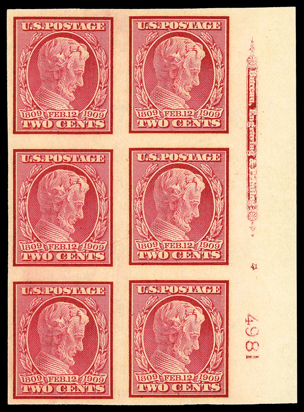 6573 nhbl 368 image1909, 2¢ Lincoln Centenary, imperf. (Scott 368), right margin plate block of 6 with star and plate number 4981, Rich color glowing with life, o.g., never hinged, Very Fine.