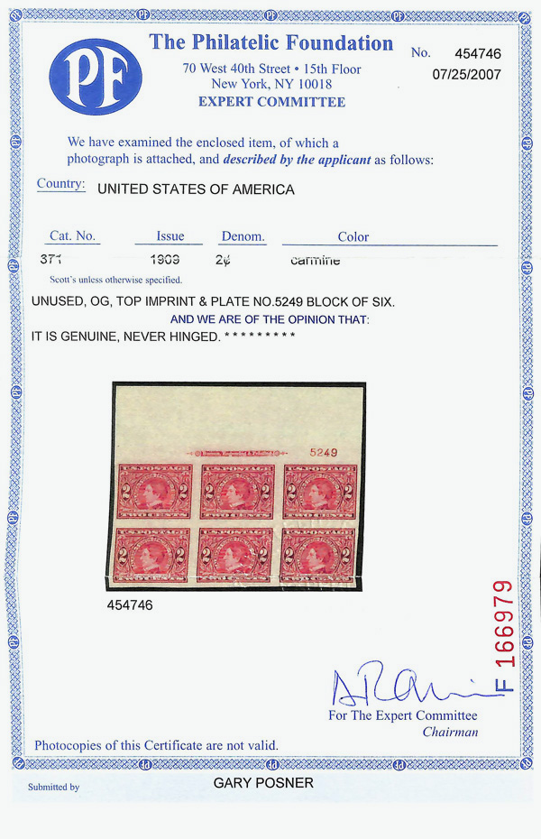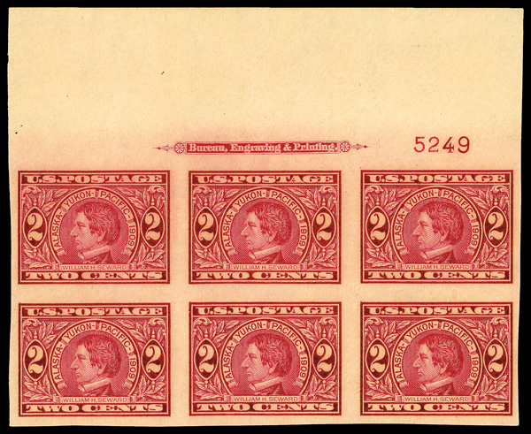 6576 nhbl 371 image1909, 2¢ Alaska-Yukon, imperf. (Scott 371), wide top margin plate block of 6 with plate number 5249, Deeply inked with natural freshness, o.g., never hinged, Very Fine, with 2007 P.F. certificate.