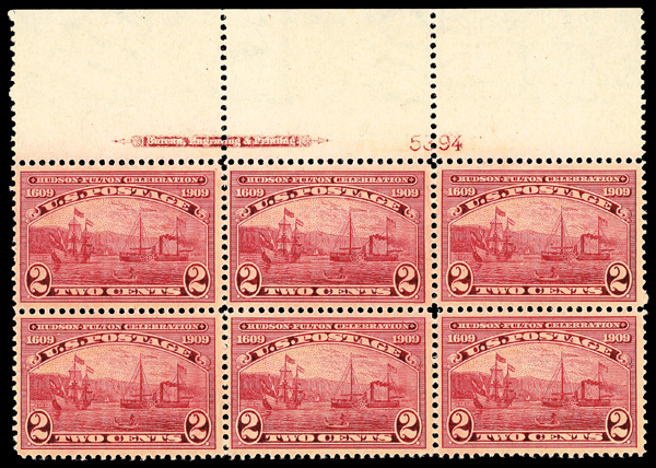 6577 nhbl 372 image1909, 2¢ Hudson-Fulton (Scott 372), wide top margin plate block of 6 with plate number 5394, Deep color, beautifully struck, o.g., never hinged, Very Fine.