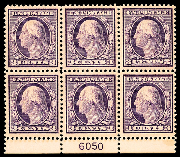 6580 nh/ogbl 376 image1911, 3¢ deep violet, type I, S.L. watermark (Scott 376), bottom margin plate block of 6 with plate number 6050, Crisp printing with bold tone, center stamps very well centered, o.g., lightly hinged (3 stamps never hinged), Very Fine to Extremely Fine.