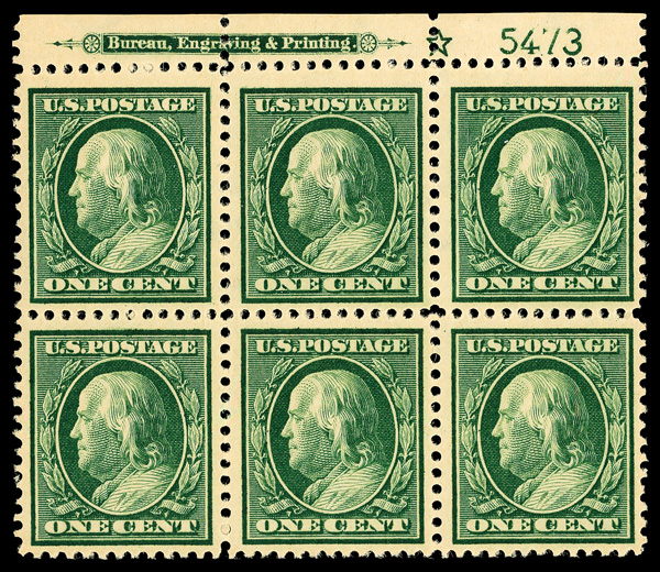 6579 nhbl 374 image1910, 1¢ green, S.L. watermark (Scott 374), top margin plate block of 6 with star and plate number 5473, Bright ink appearance, o.g., never hinged, Very Fine.