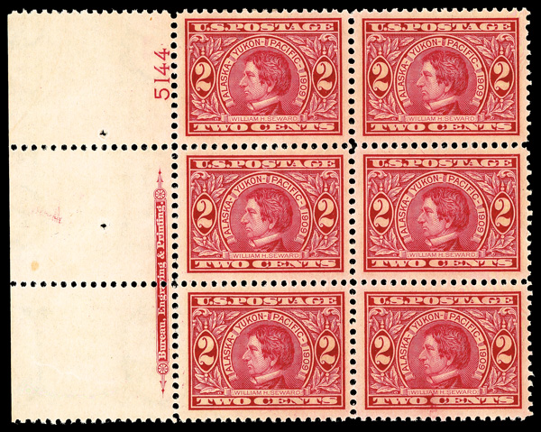 6574 nhbl 370 image1909, 2¢ Alaska-Yukon (Scott 370), wide left margin plate block of 6 with plate number 5144, Deep color with glowing presence, o.g., never hinged; slight gum disturbance top left stamp, light gum wrinkle on lower selvage, Very Fine to Extremely Fine.