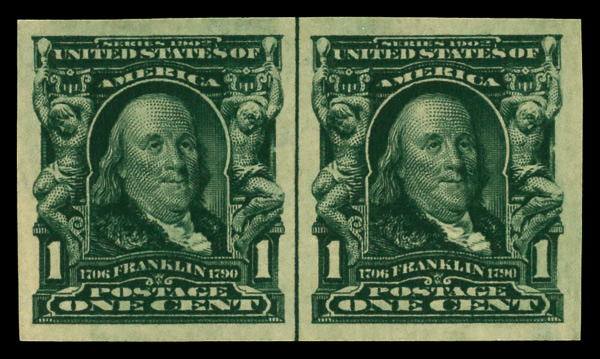 6552 nh 314 image1906, 1¢ blue green, imperf. (Scott 314), horizontal pair with guide line between, o.g., never hinged, Extremely Fine.
