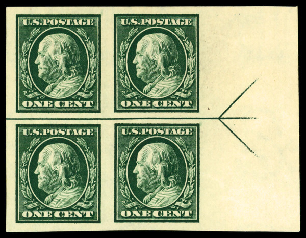 6562 nhbl 343 image1908, 1¢ green, D.L. watermark, imperf. (Scott 343), arrow block of 4 (3mm spacing), o.g., never hinged, Extremely Fine to Superb.