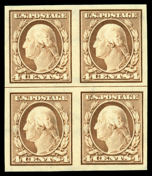 6567 nhbl 346 image1909, 4¢ orange brown, D.L. watermark, imperf. (Scott 346), block of 4 with horizontal guide line (2mm spacing), o.g., never hinged, Extremely Fine.