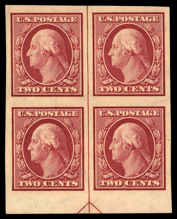 6565 nhbl 344 image1908, 2¢ carmine, D.L. watermark, imperf. (Scott 344), arrow block of 4, o.g., never hinged, Very Fine to Extremely Fine.