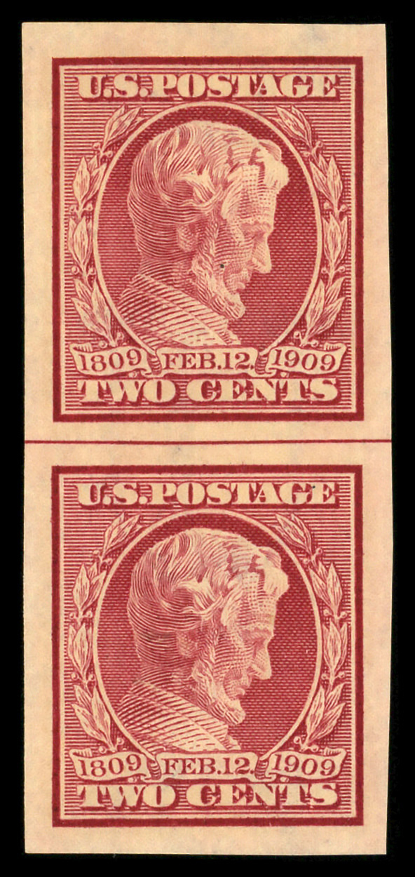 6572 nh 368 image1909, 2¢ Lincoln Centenary, imperf. (Scott 368), vertical pair with horizontal guide line, o.g., never hinged, Extremely Fine.