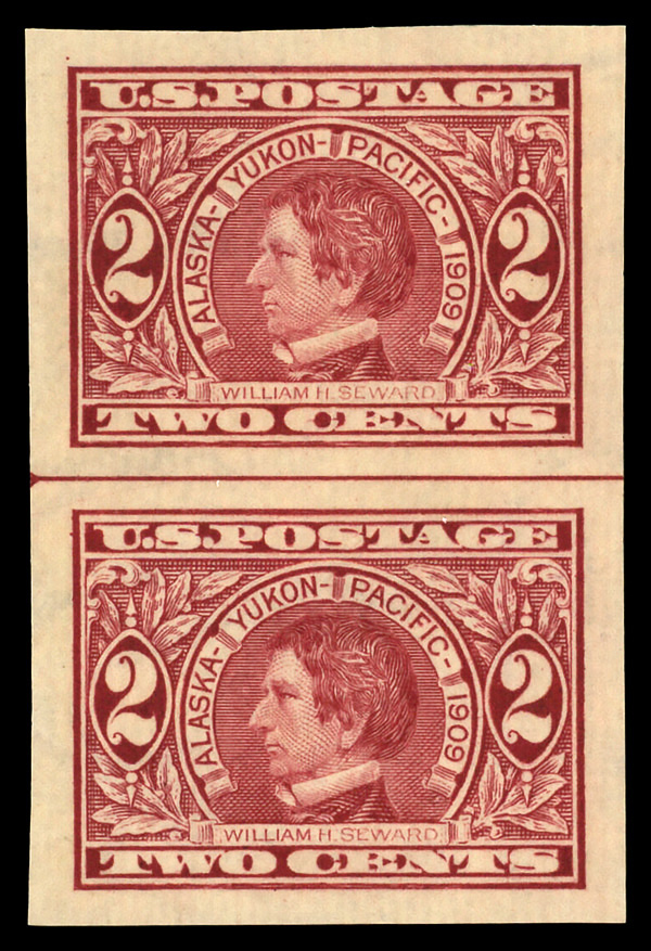 6575 nh 371 image1909, 2¢ Alaska-Yukon, imperf. (Scott 371), vertical pair with horizontal guide line, o.g., never hinged, Superb.