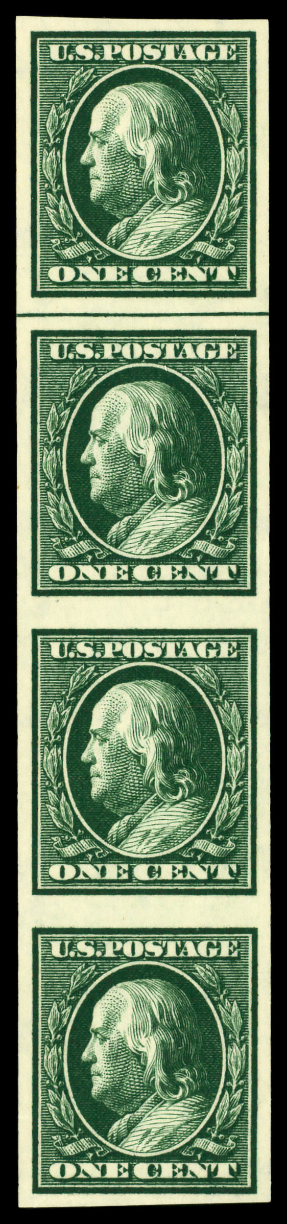 6563 nh 343V image1908, 1¢ green, D.L. watermark, imperf., vertical coil (Scott 343V), guide line strip of 4, o.g., never hinged, Very Fine to Extremely Fine.