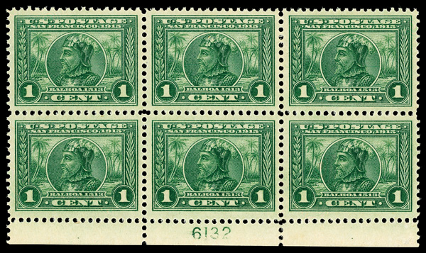 6583 nhbl 397 image1913, 1¢ Panama-Pacific, perf. 12 (Scott 397), bottom margin plate block of 6 with plate number 6132, Bright and evenly printed color, o.g., never hinged, Very Fine.